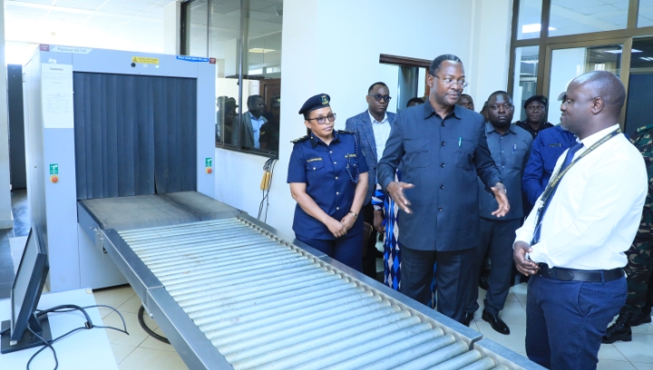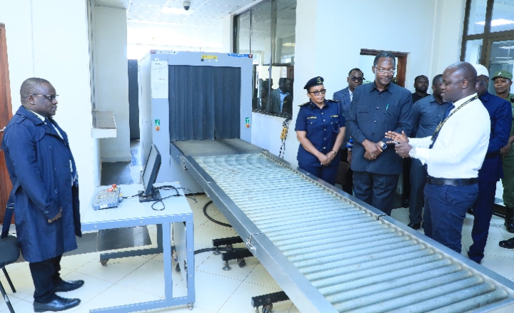 Waziri wa Mambo ya Ndani ya Nchi, George Simbachawene akipita katika mtambo wa ukaguzi wa magari uliopo katika Kituo cha Forodha cha Pamoja cha Mutukula kilichopo wilayani Misenyi,mkoani Kagera ambapo ni mpaka kati ya Tanzania na Uganda.Kushoto ni Mfawidhi wa Kituo cha Uhamiaji Mtukula,Mrakibu Mwandamizi wa Uhamiaji,Sarah Ngonyani na kulia ni Afisa wa Mamlaka ya Mapato Tanzania(TRA), Edmund Lubinza. Picha na Wizara ya Mambo ya Ndani ya Nchi
