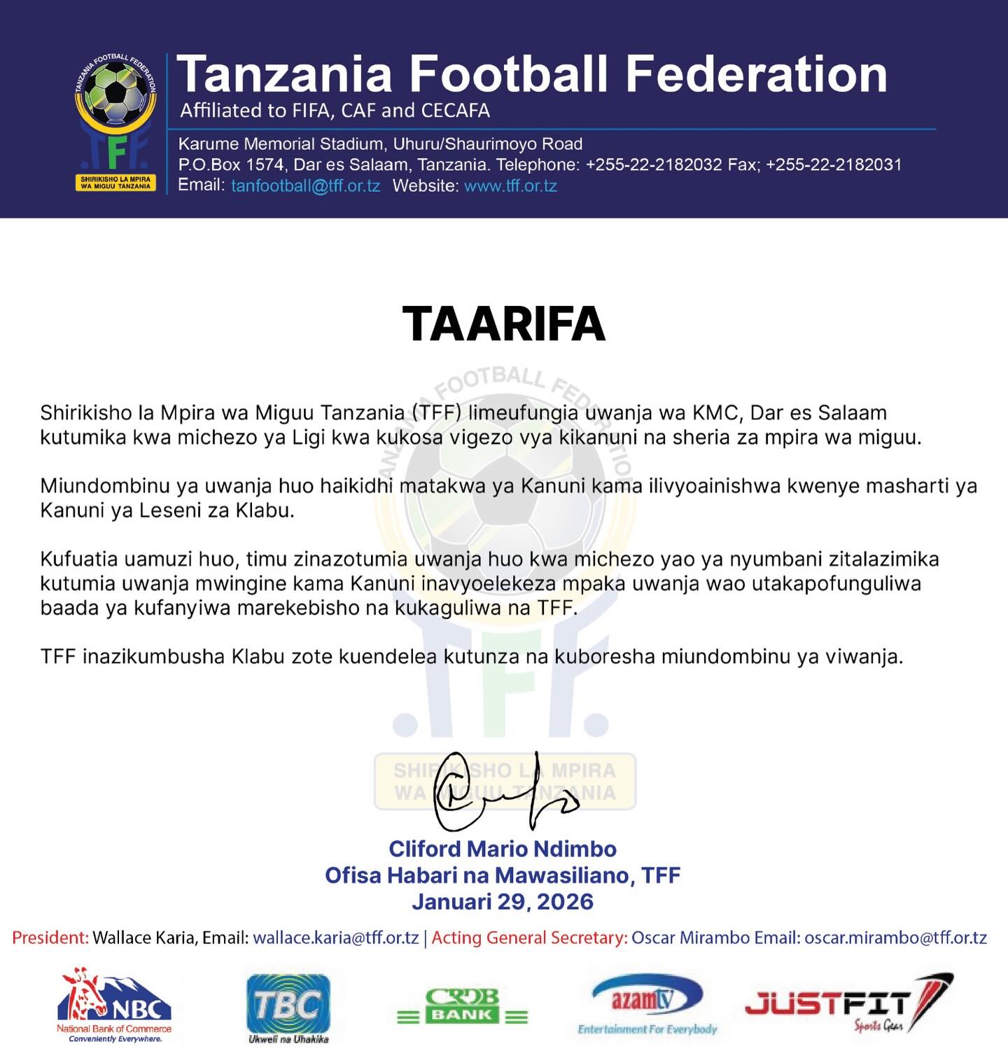 TFF imesisitiza kuwa itaendelea kusimamia utekelezaji wa Kanuni na kuzitaka klabu zote nchini kuendelea kutunza na kuboresha miundombinu ya viwanja ili kukidhi viwango vinavyotakiwa kwa michezo ya Ligi.