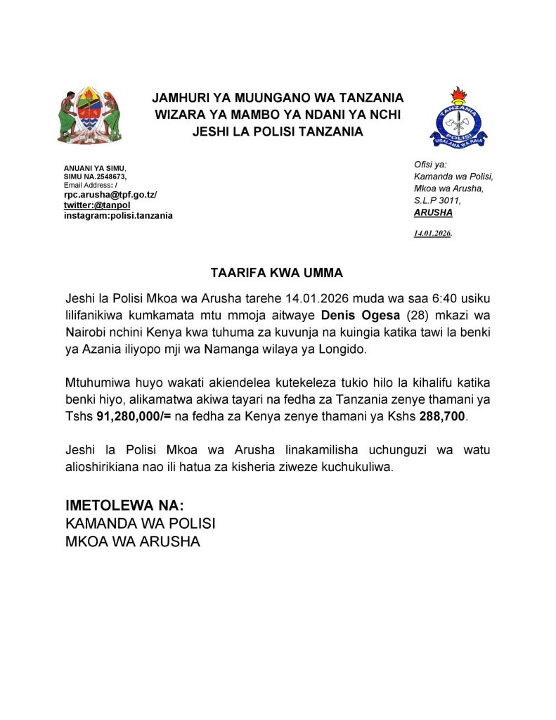 Jeshi la Polisi Mkoa wa Arusha limefanikiwa kumkamata mtu mmoja aitwaye Denis Ogesa (28) mkazi wa Nairobi nchini Kenya, kwa tuhuma za kuvunja na kuingia katika tawi la benki ya Azania iliyopo katika mji wa Namanga wilayani Longido.