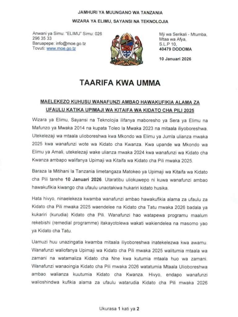 HomeELIMU WALIOFELI KIDATO CHA PILI KUENDELEA NA KIDATO CHA TATU Misalaba Media January 10, 2026 0 MATOKEO YA UPIMAJI WA KITAIFA WA DARASA LA NNE (SFNA) 2025MATOKEO YA UPIMAJI WA KITAIFA WA KIDATO CHA PILI (FTNA) 2025 You Might Like View all